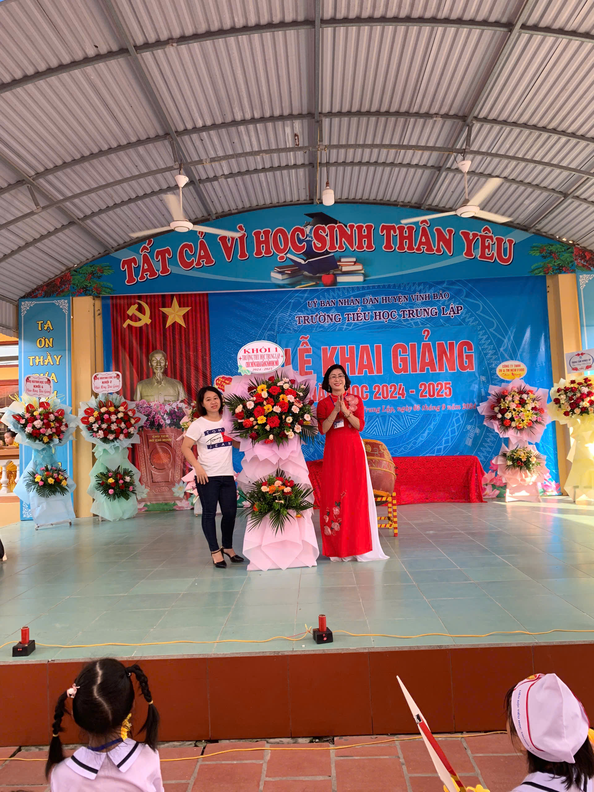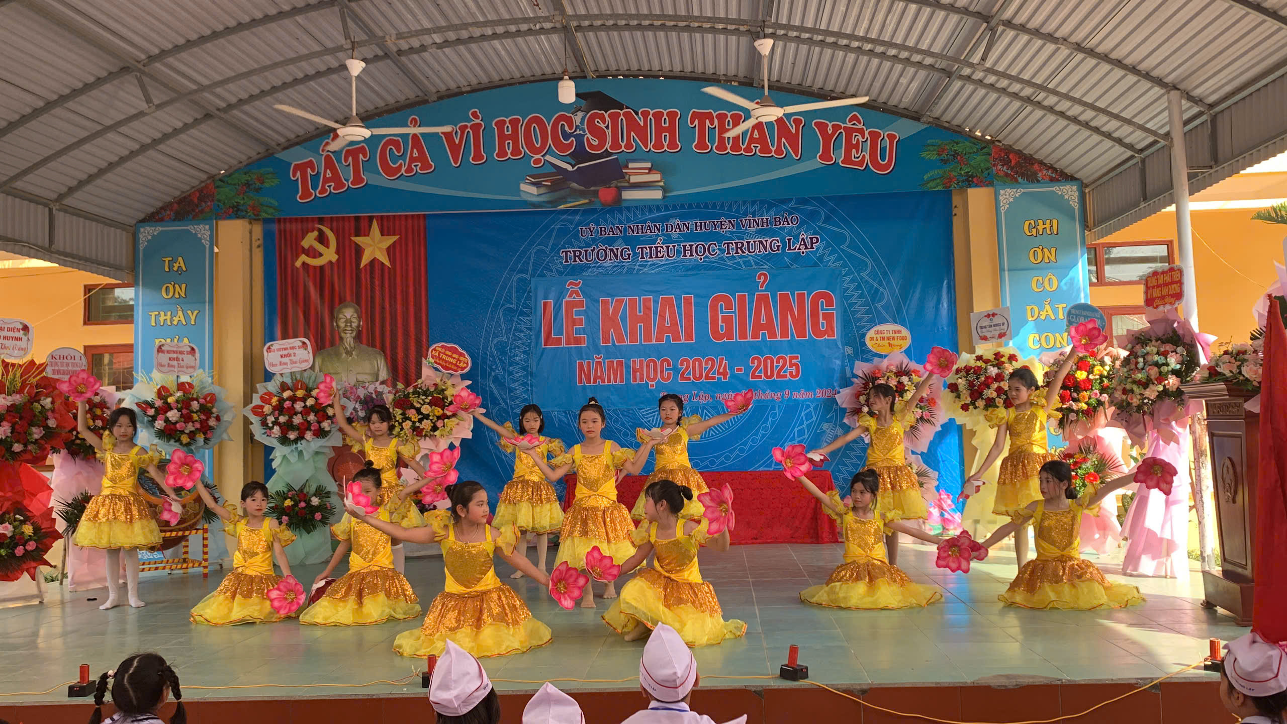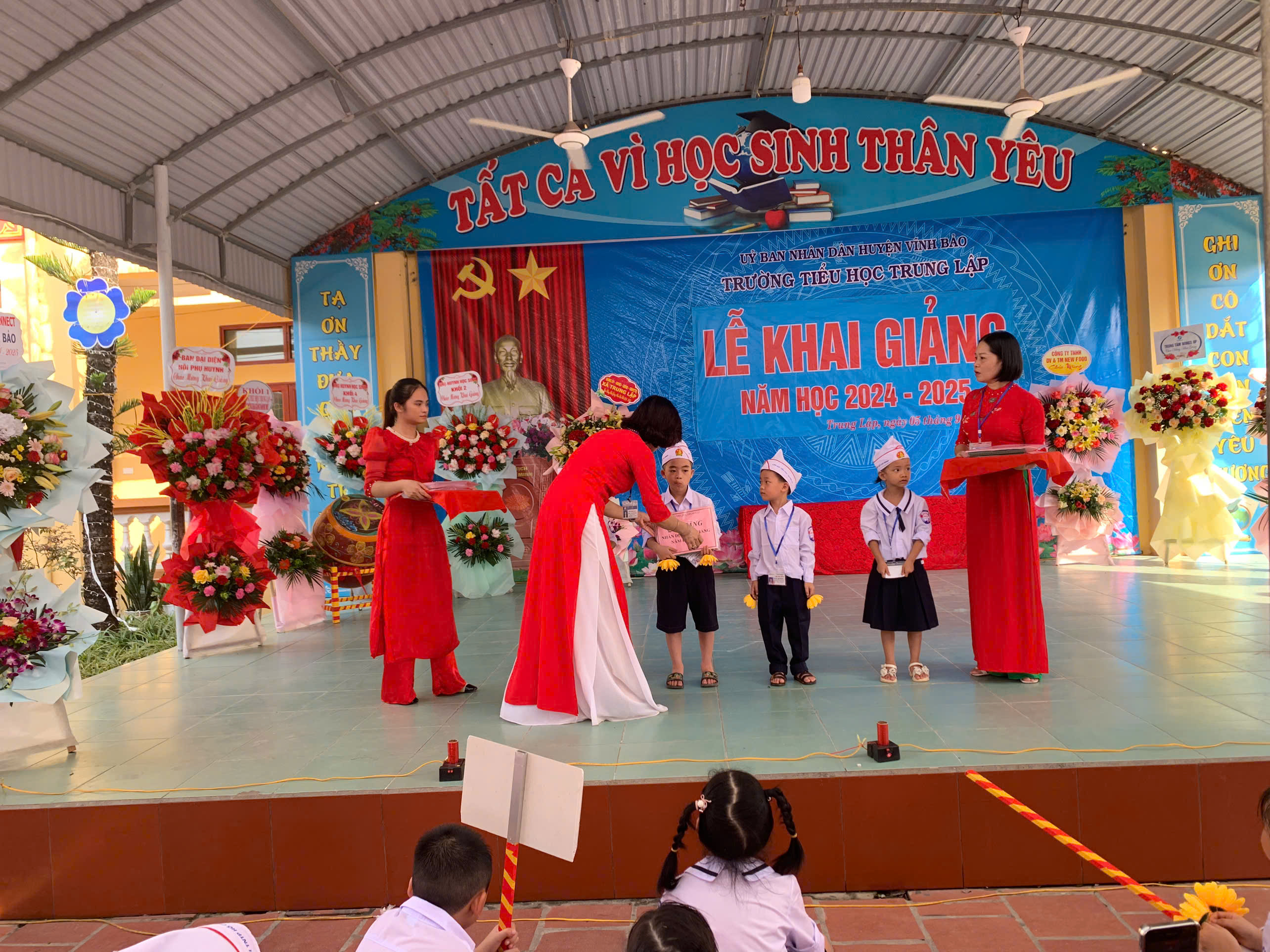 Trong không khí trang nghiêm của buổi lễ, các em được nghe thư của Chủ tịch Hồ Chí Minh gửi các cháu học sinh nhân ngày khai trường đầu tiên của nước Việt Nam Dân chủ Cộng hoà, thư của Tổng Bí thư, Chủ tịch nước Tô Lâm gửi ngành Giáo dục nhân ngày khai giảng năm học 2024 - 2025.