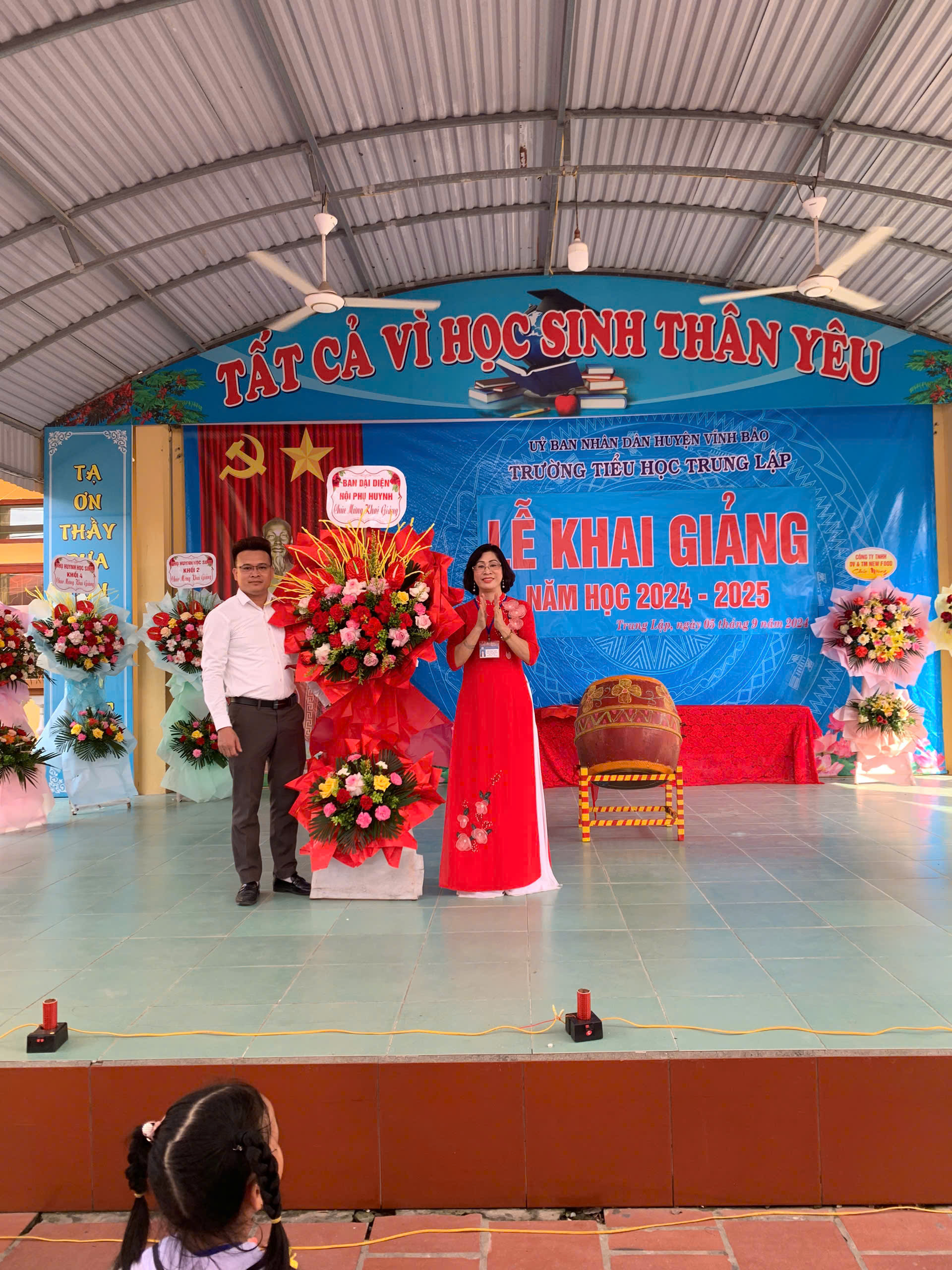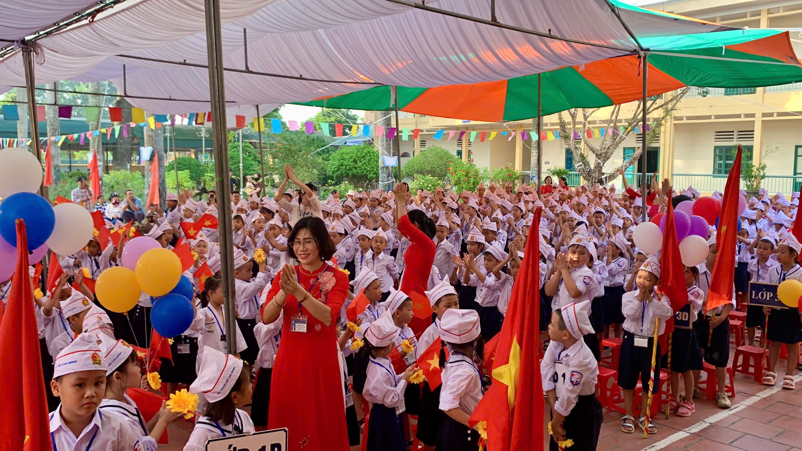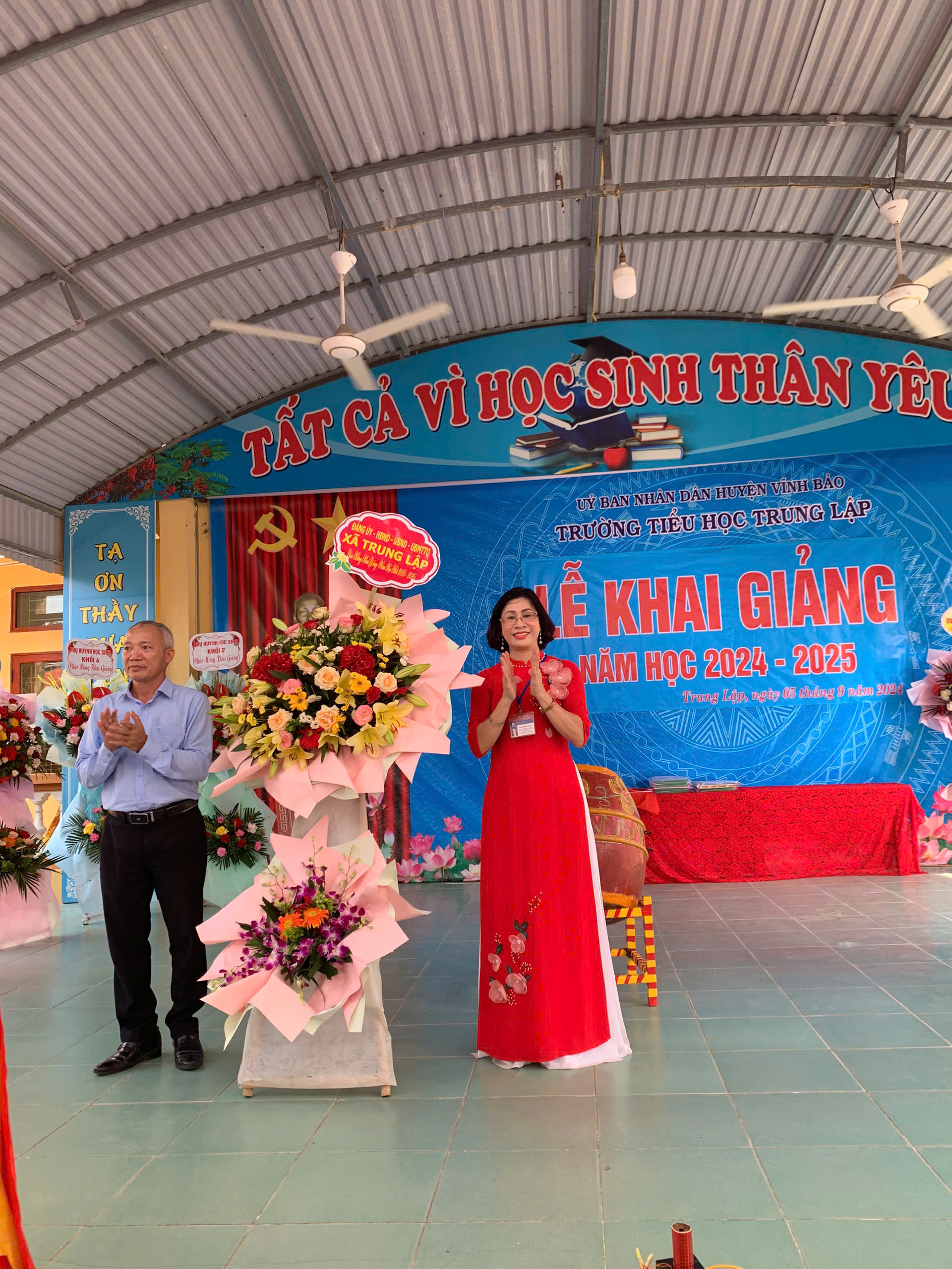 Cô Đào Thị Hương - Bí thư Chi bộ, Hiệu trưởng nhà trường đọc Diễn văn khai giảng, đánh trống khai trường.